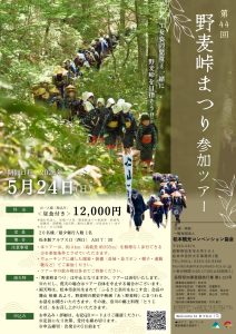 主催:松本観光コンベンション協会募集中第44回野麦峠祭り参加ツアー ※荒天によりお祭りが中止の場合 奈川支所にて地域の方に野麦峠の歴史について講演いただく。 そばの里奈川にてとうじそばを召し上がっていただきます。 今年、44回目となる野麦峠祭りにご参加いただきます。 出発式をわさび沢で行ったあと、工女やボッカに扮した地元の子供たちと共に約1.5km(1時間程度)を歩きます。 峠到着後は子安諏訪神社祇園囃子や糸引き工女の唄、野麦イササ踊りをお楽しみいただき 食事券(1,000円)を使いブース販売(五目寿司、おやき、ピザ)でお食事等をお召し上がりください。 帰路はマイクロバスにて川浦まで移動し、大型バスに乗り換え奈川山彩館へ移動します。 最後は旧奈川村入山宿にあった「旅籠松田屋」「青木神社」を見学していただきます。第44回野麦峠祭り参加ツアー PDFファイル(2 MB)PDFをダウンロード開催日2026月5月24日(日)申込期日2026年5月19日(火)場所松本市奈川集合場所松本駅アルプス口団体バス乗車場Google MAP料金¥12,000 ( お一人様/1,000円分の食事クーポン付き ) 予約はこちら 定員20名最低催行人数1名主催者松本観光コンベンション協会お問い合わせ0263-60-8480(松本観光コンベンション協会)(平日9:00~17:00)